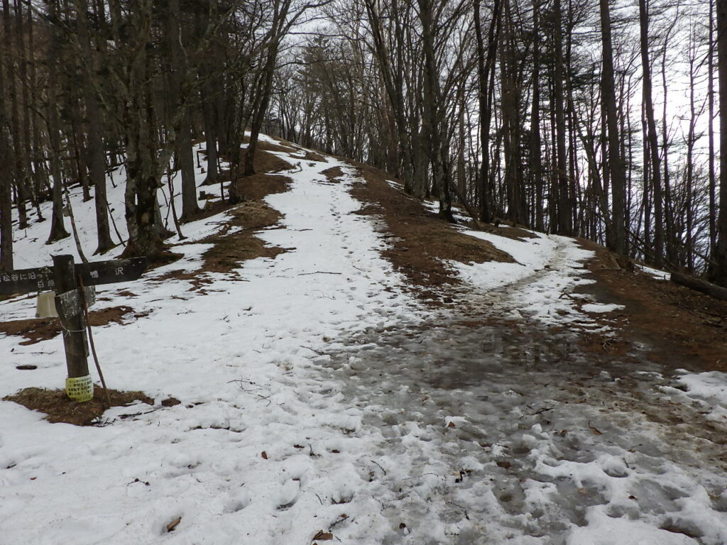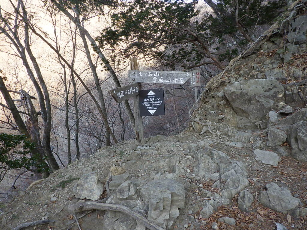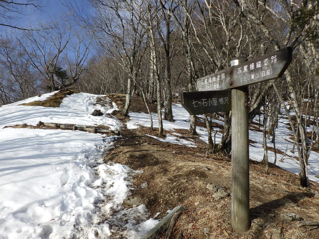 しばらく行くと、七ツ石小屋経由で七ツ石山に登る尾根ルートと楽な巻き道くルートの分岐があった。