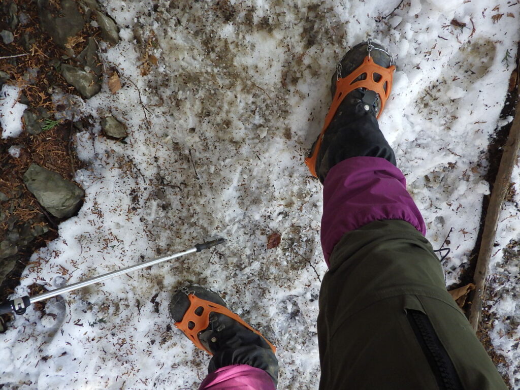 12爪タイプのアイゼンも持っているが、最近の冬山登山は2000m未満の山が多く、もっぱらチェーンスパイクを使っている。