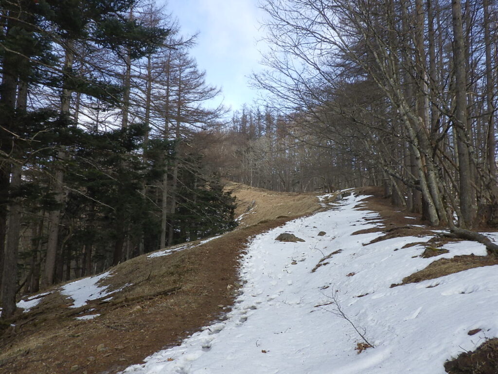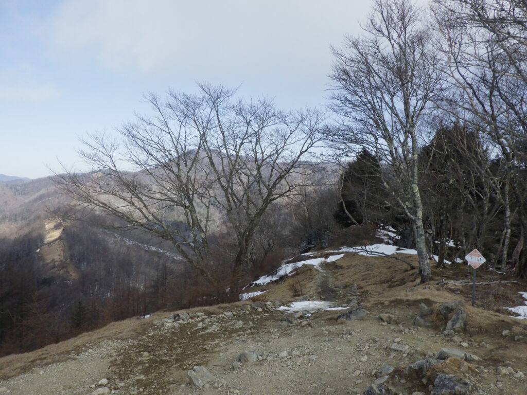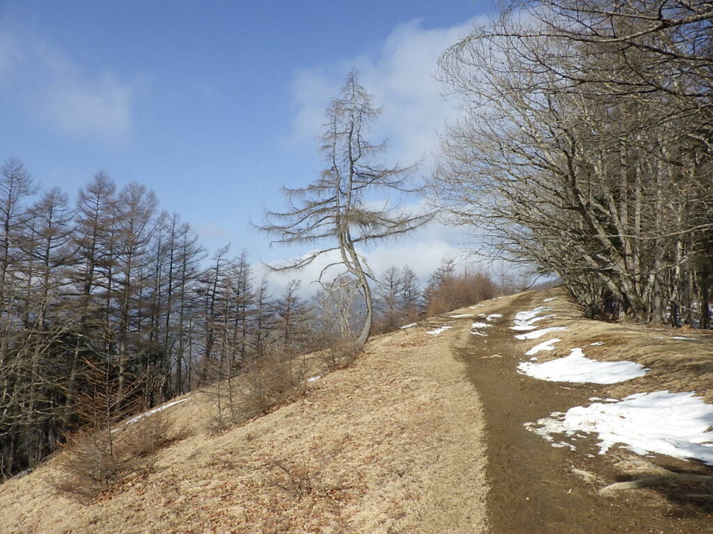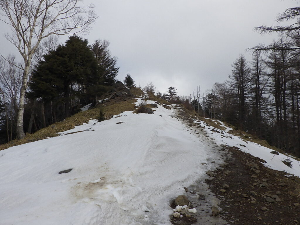 頂上付近は陽当たりが良いせいか風が強いせいか雪がついていなかった。