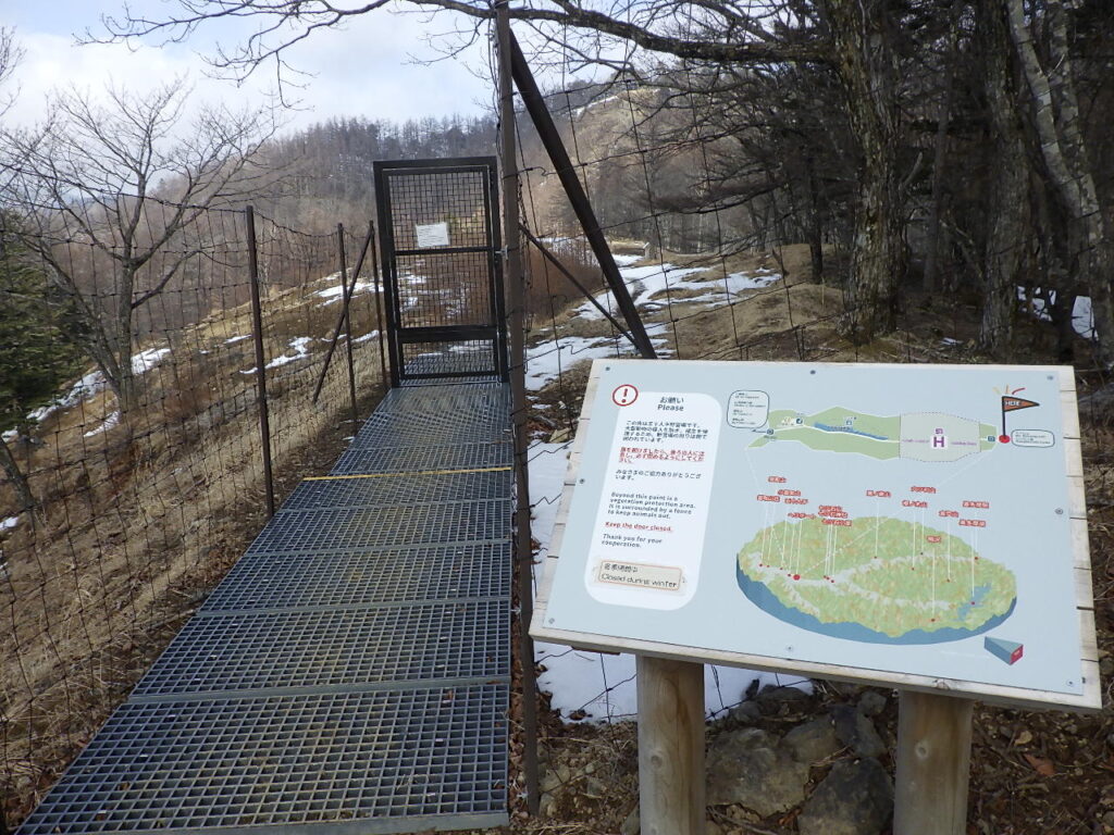 広い尾根にヘリポートと五十人平キャンプ場(冬期休業中)があるが、鹿などの野生動物から守るためにゲートが作られていた!