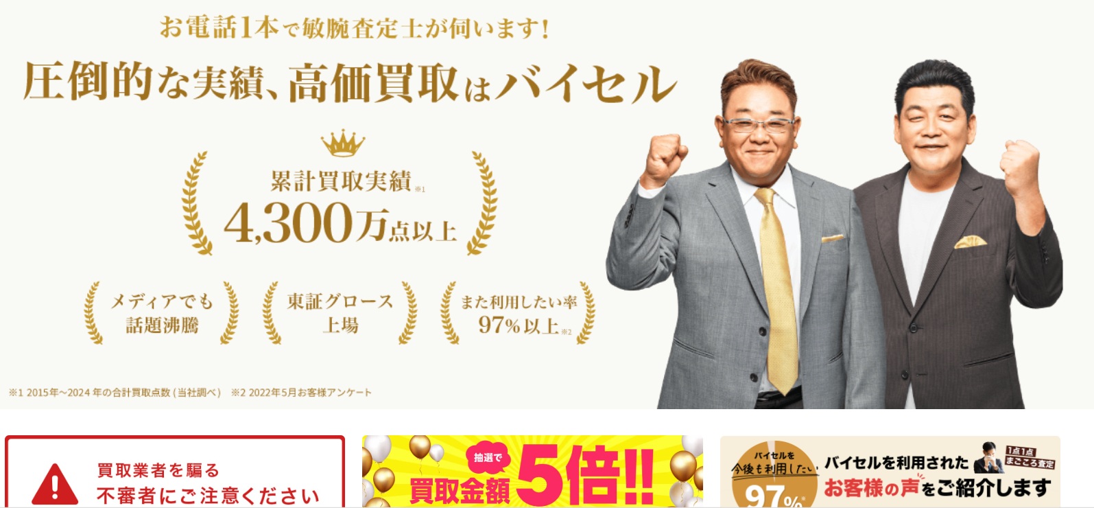 ![]() | バイセル 🥇おすすめ | 全国 | メール:24時間 電話:24時間 | 〇 | 〇 | 〇 | ・東証上場企業が運営 ・出張買取メイン |